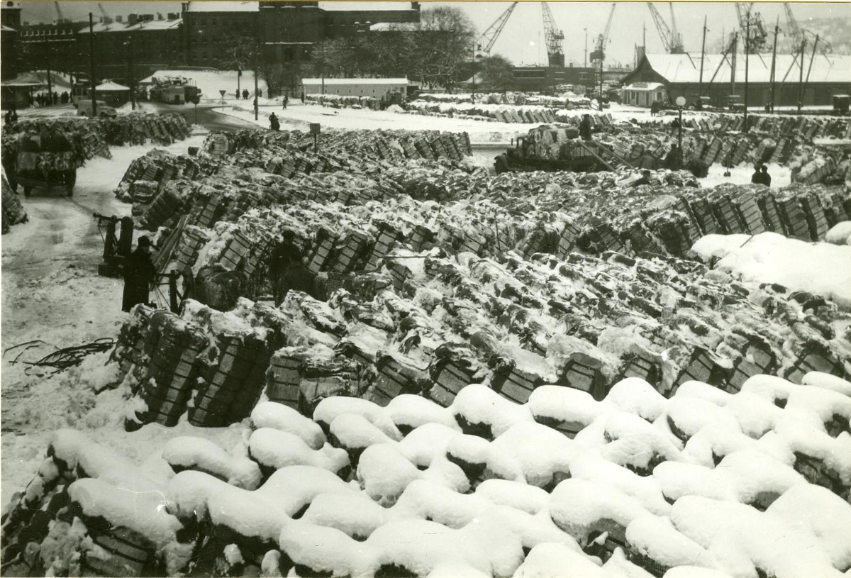 Godsanhopning (bomullsbalar) vid Lilla Bommen.