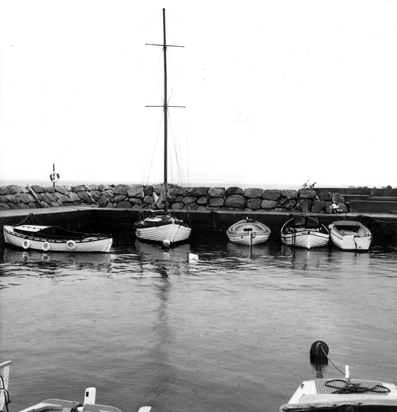 Skåne, Kristiansstads län, V Barkåkra socken, Vejbystrand. Hamnen. Den inre vågbrytaren som går parallellt med strandlinjen. SO delen tv en bit av SO kajen.
