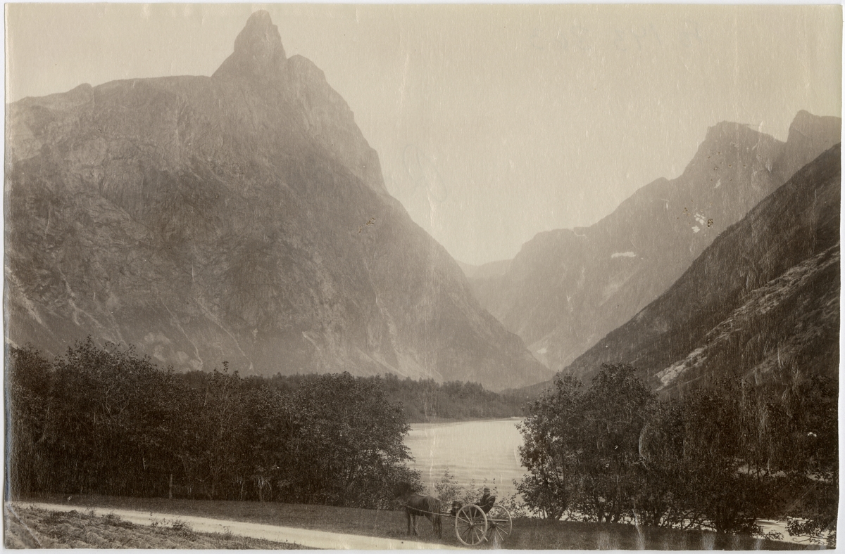 Romdalshorn i Norge. I förgrunden häst med vagn samt en kvinnlig (?) passagerare.
