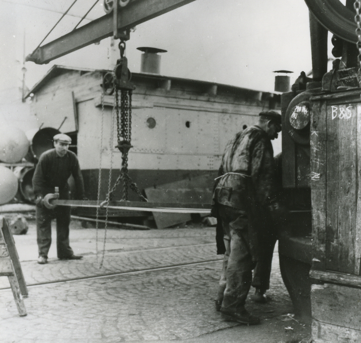 Oskarshamns varv. Plåtpressning. Klippning av press på den sida av skeppsbyggeripresset som var mot satt profilsidan. Den förra sidan kallades "Wernqvistens press" Efter basen. Basen Wernqvist står med ryggen mot kameran.