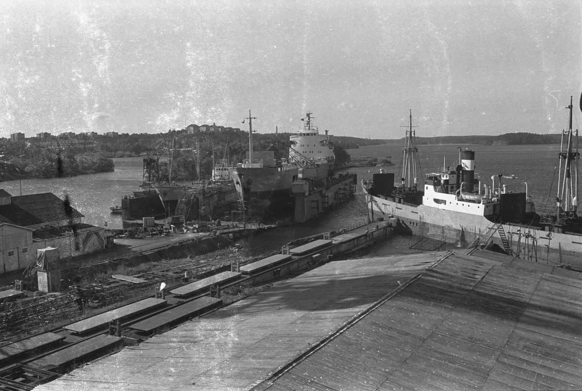 Ekensbergs varv 1970. I bakgrunden fr v till h i lilla dockan HEIMATLAND, i stora dockan SALOME och slutligen KINGHAM (urspr. HARÖ).