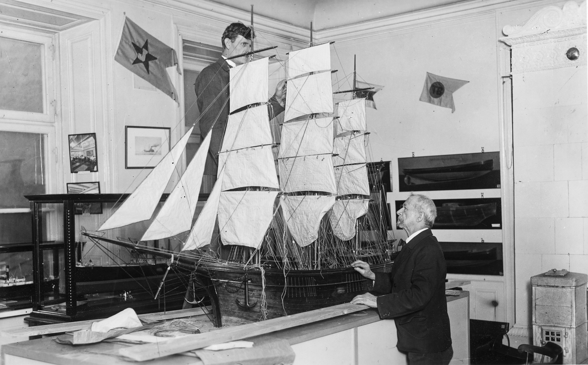 Sjöfartsmuseet, Skeppsbron 36, Stockholm. Den Settervallska modellen under riggning. Arbetet utförs av segelmakaren Gustaf Wiman och sjökaptenen Carl Lindqvist.