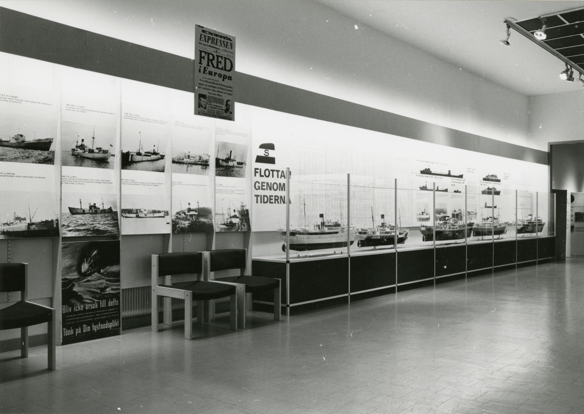 Jubileumsutställningen "Rederi Svea 100 år". Utställningsinteriör om flottan genom tiderna. Fotografier på väggen och fartygsmodeller i lång monter.