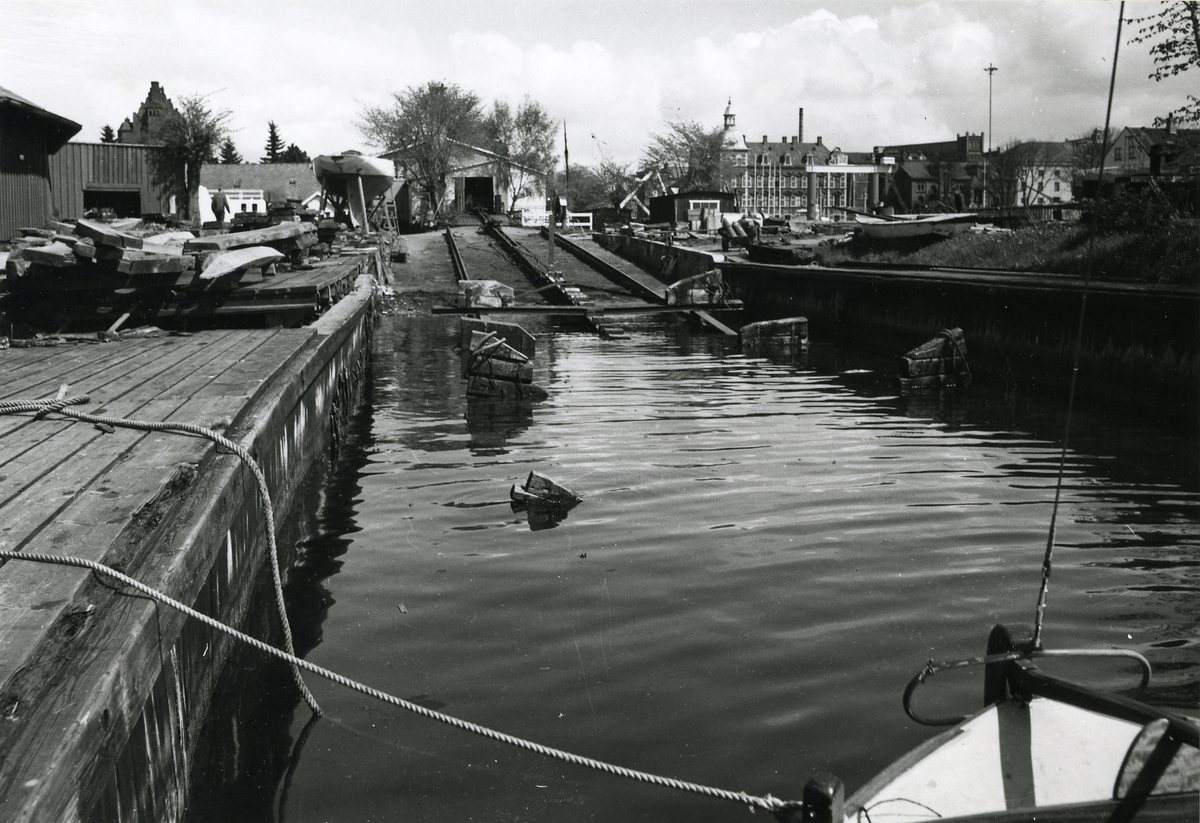 Ledstängerna har fastgjorts, och motorverket drager fartyget upp ur vattnet.