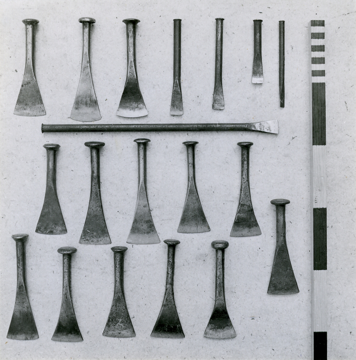Sättjärn /2st/, krokigt dto, små krokjärn, långt sättjärn, enkelrabbar, utan spår, / platta 5 st/, dubbelrabb m tre spår, enkelrabbar med två spår /3st/, krokiga dto /2st/.