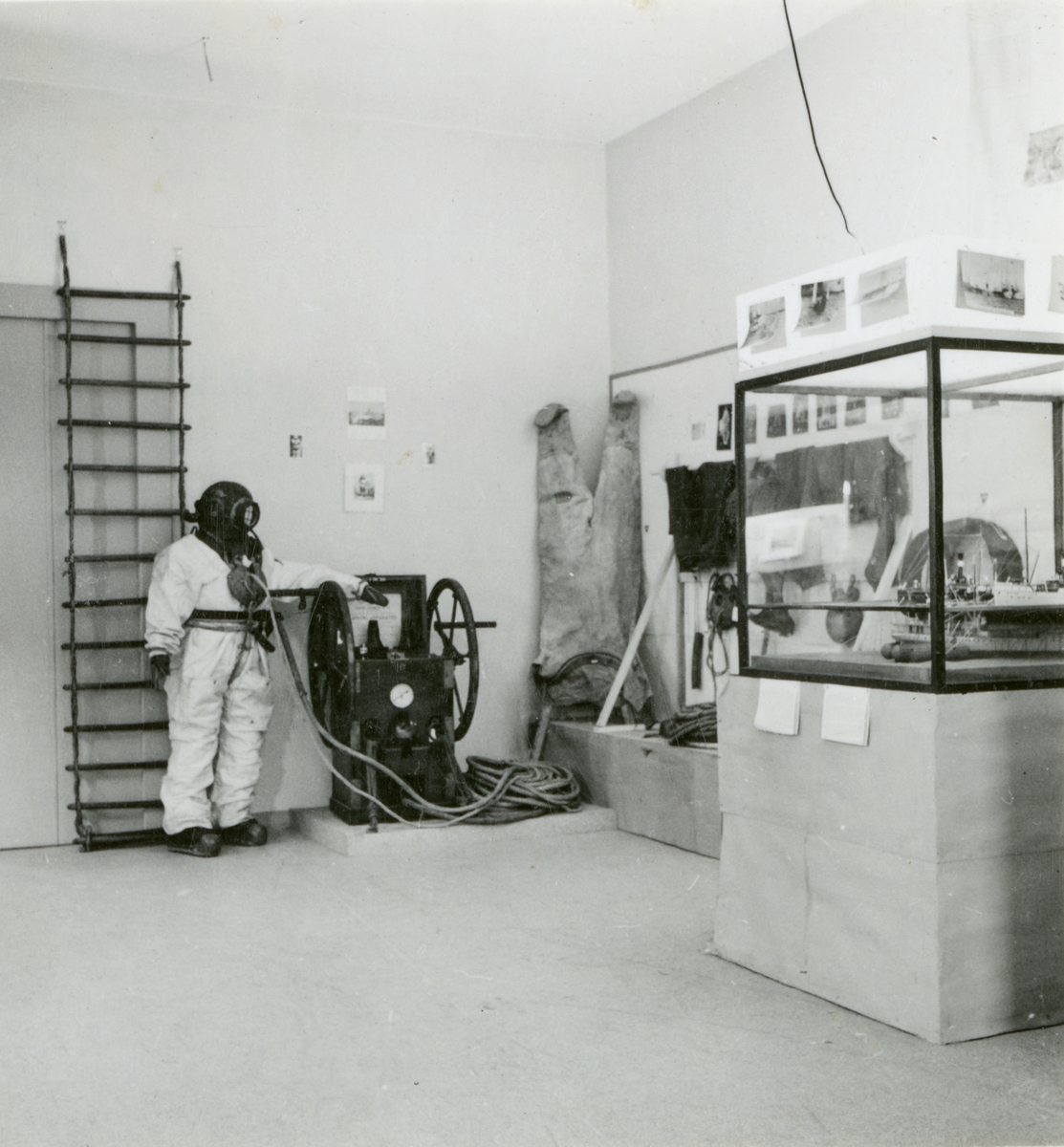 Samlingarna under uppordnade våren 1936. Utställningen i Sjöfartsavdelningen. Avdelningen för dykeri och bärgning.