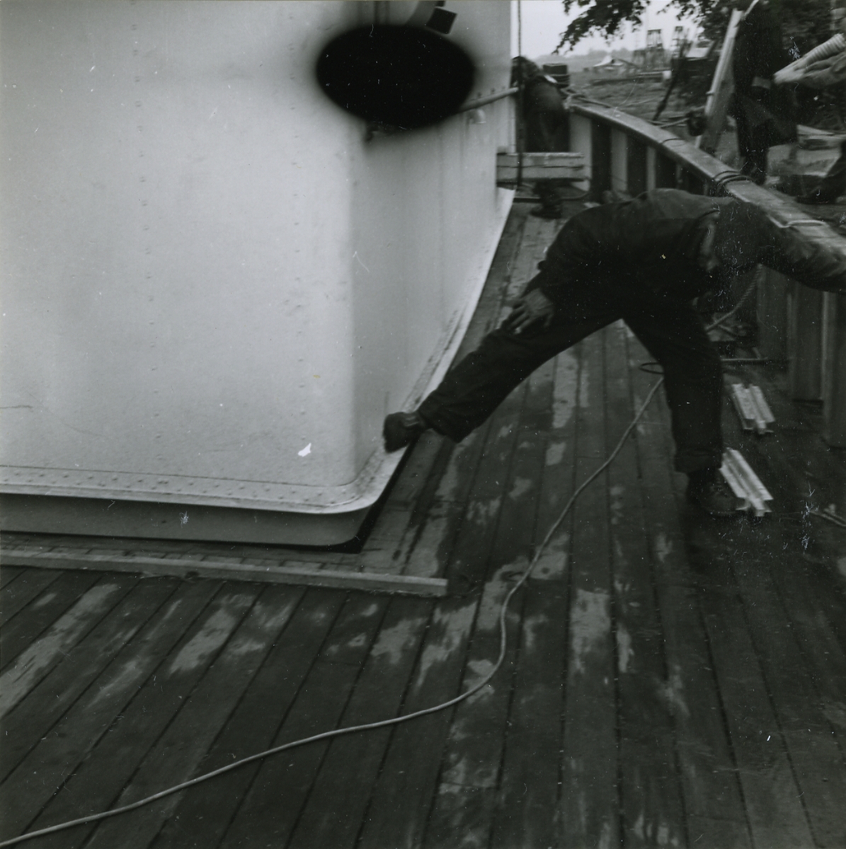 En man för däckshuset till det exakta läget över öppningen i däcket.