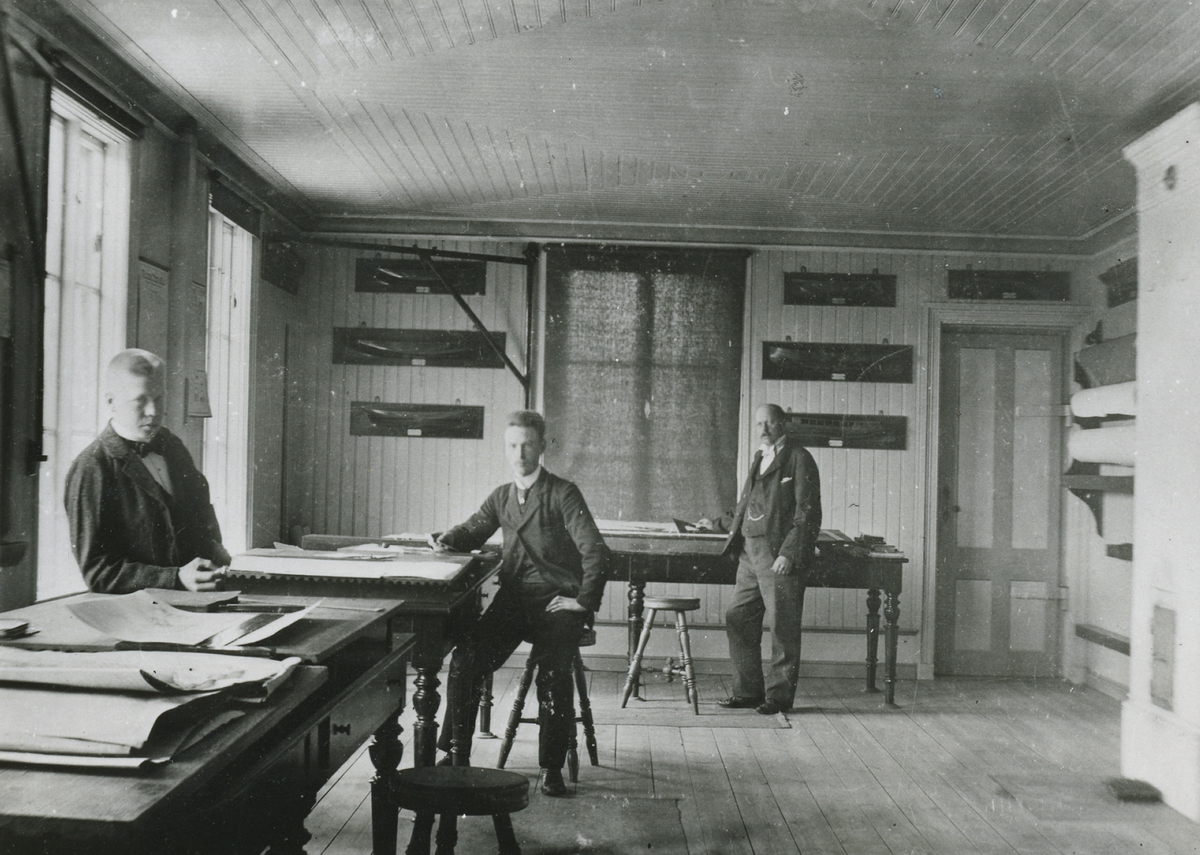 Ritkontoret vid Oskarshamns mekaniska verkstad. Gamla ritkontoret. T.v ritbiträdet Edvin Magnusson,sen. Magner, i mitten skeppskonstruktören Gustaf Skeppsstedt- (slutade 1919/20), t.h. maskinritaren Axel Åberg. "Giöbel och Skeppstedt hade hand om avdelningen. När det var bråttom satt far (Skeppstedt) hela nätterna hemma och ritade i lampljus".