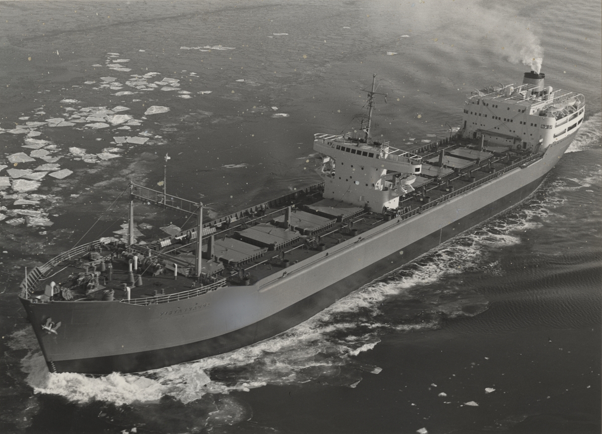 Motorbulkfartyget(Malm-olja) (sic!) VISTASVAGGE av Stockholm. Foto från provresan 1955.