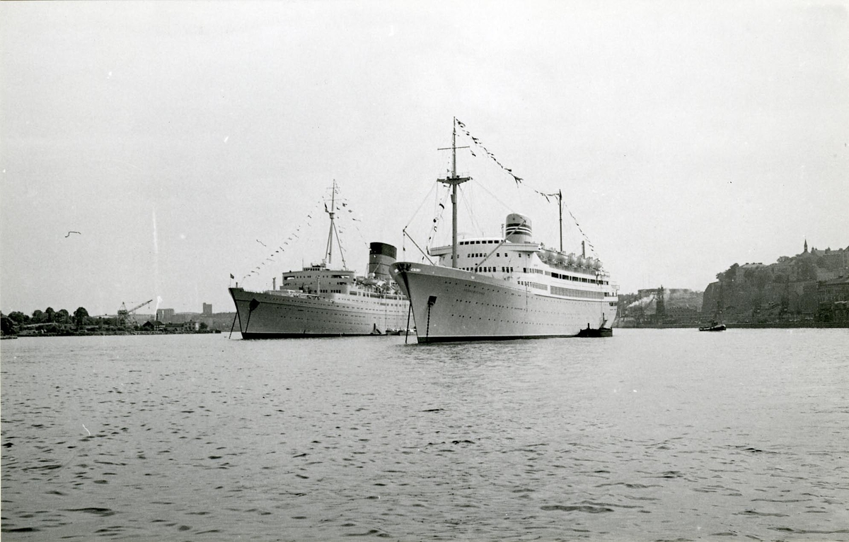 Foto från 1959 visande turist- och passagerarfartygen "Caronia" och "Bergensfjord" för ankar på Stockholms ström.