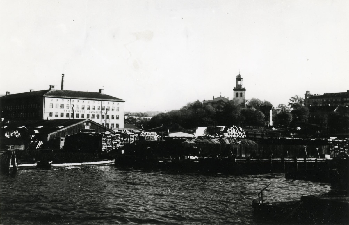 Foto i svartvitt visande östra delen av nuvarande Majnabbehamnen med Carl Johans kyrka i bakgrunden. Här låg i början av seklet en såganläggning. På 30,40-talet hade Brattrederierna en anläggning för bränsle, trä, ved här