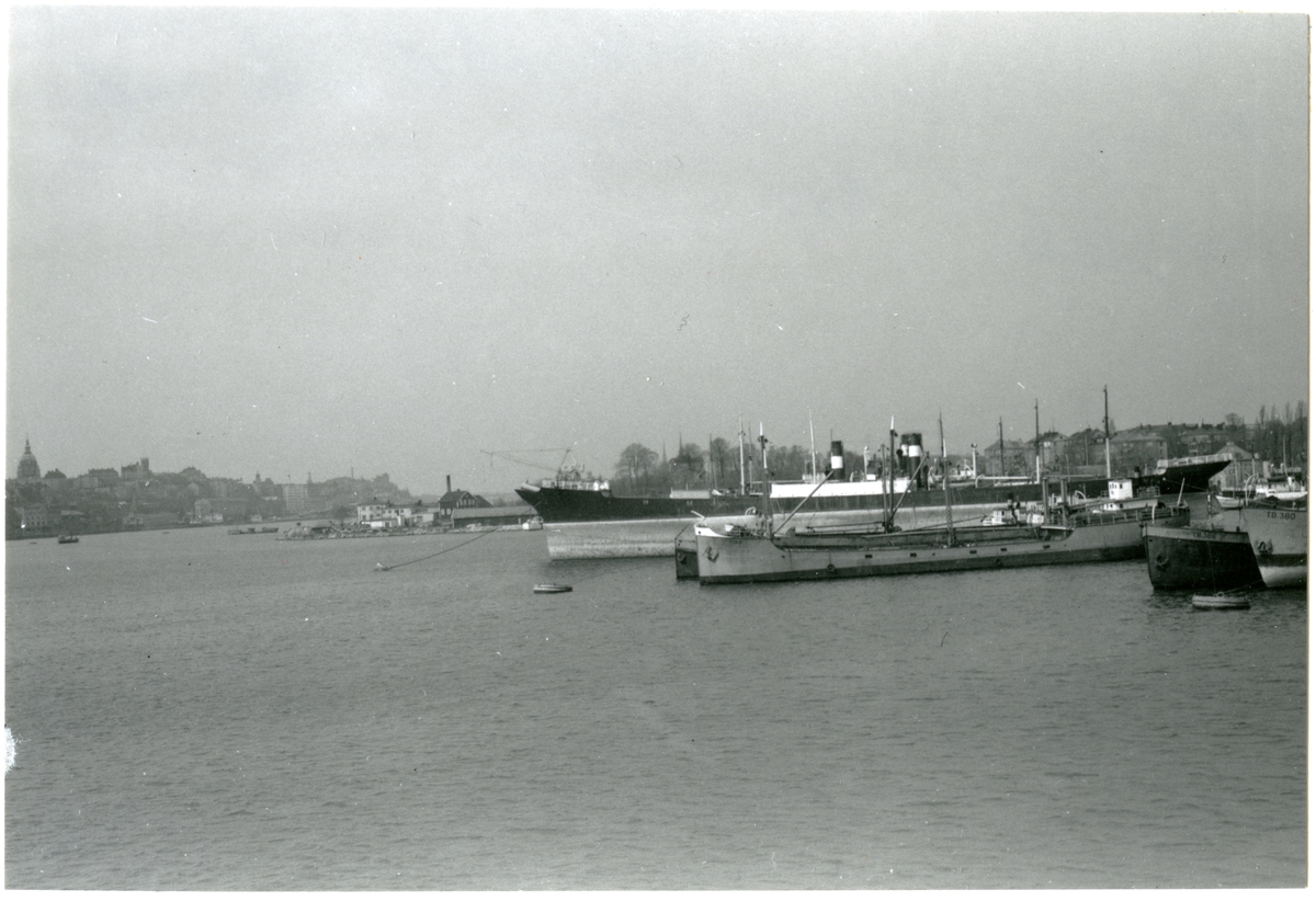 [från fotobeskrivningen:] [---] "F d 4-mastbarken MOSHULU avmastad och upplagd i Ryssviken, Stockholm våren 1959." [---]