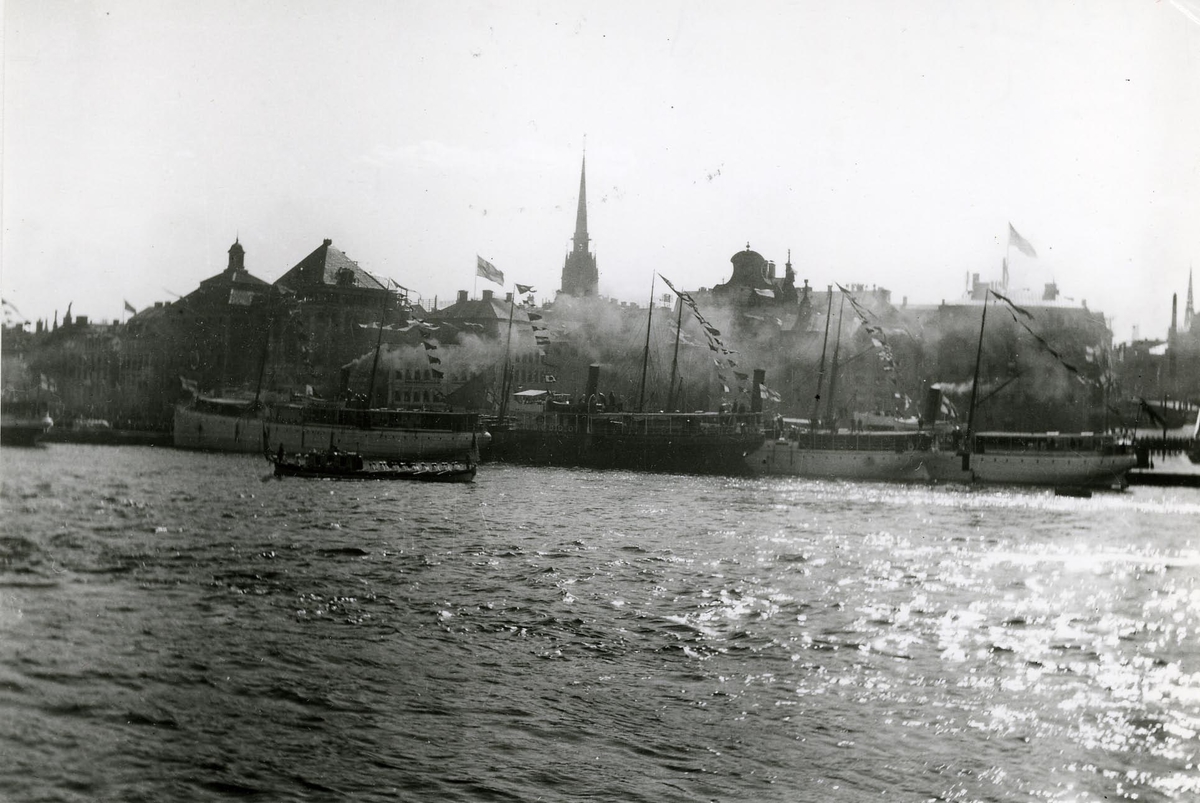 Skeppsbron med ett flertal ångare. I förgrunden kungaslupen Vasaorden, 1912 - 1917.