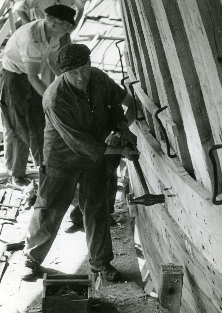 "Sätta till bordvägsgång" på backen till Isländskt fiskefartyg under byggnad. Bordplankan spikas, sedan fästs den i läge med tvingar och "jagats".