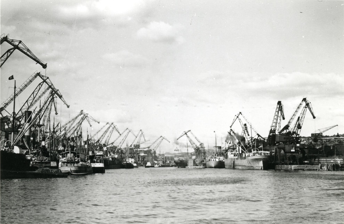 Foto i svartvitt visande Sannegårdshamnen i Göteborg fullbelagd slutet av september 1939.