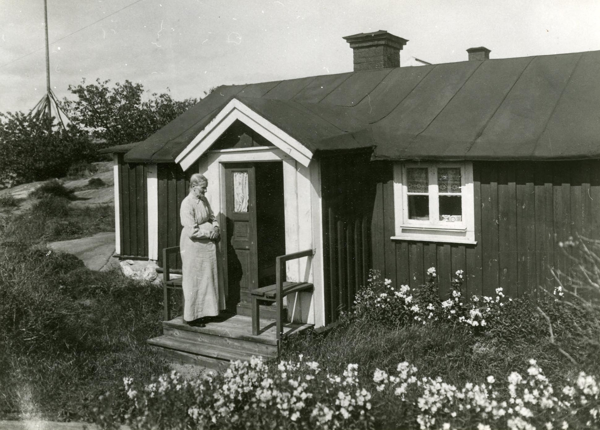 Harstena, Gryts socken, Östergötlands skärgård. Fröken Öhman, öns äldsta, vid sin gamla stuga.