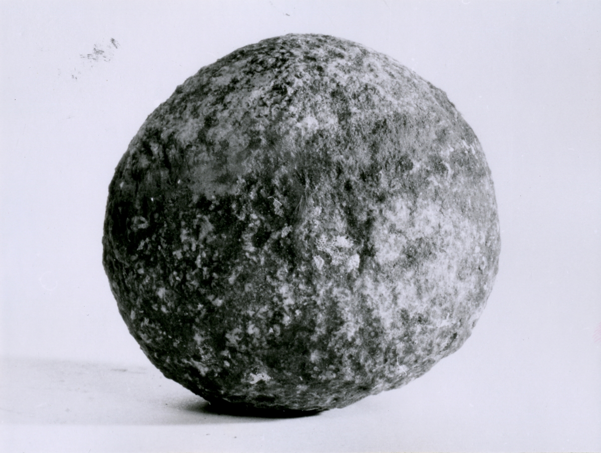 Kanonkula av sten med spår av beckkrans: Diameter 7 cm.