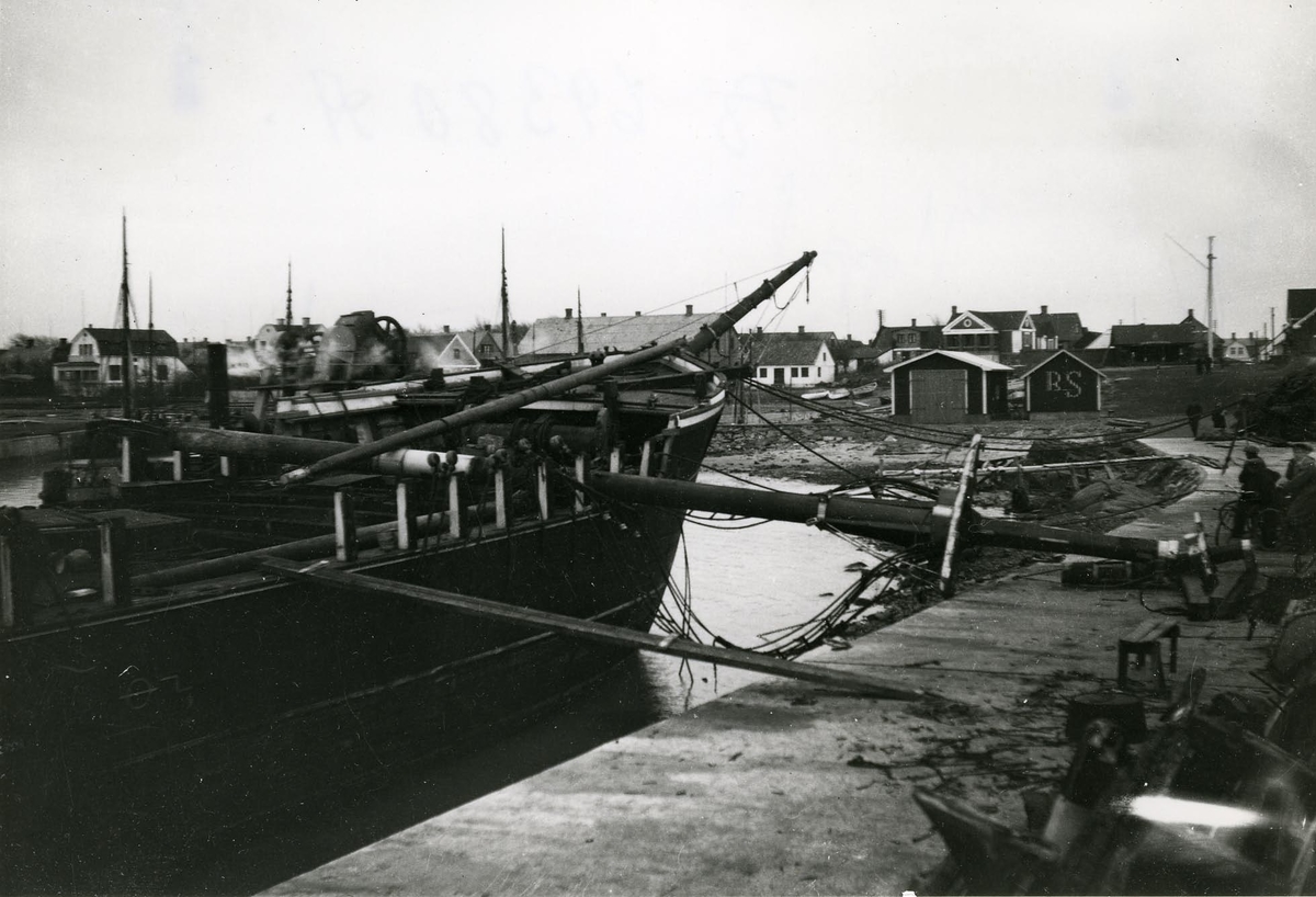 Upphuggning av skonaren Hoppet av Länna i hamnen i Torekov, Skåne. Nov. 1933.