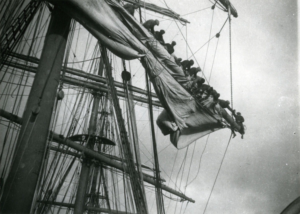 Focken bändes under 4 mastade barken Beatrice. Foto i Bluff, Nya Zeeland den 26 sept 1927.