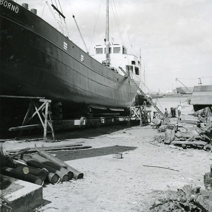 Holms skeppsvarv. Varvsgården och slipen med motorfartyget Bornö (RN 9643) Th skymtar exenterhammarens tak.