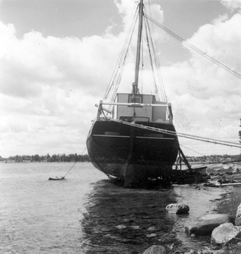 Småland, Kalmar län, Stranda härad, Ålems socken, Timmernabben. Galeasen Nils av Borgholm upptagen på tillfälligt iordningställd slip på Landsholm utanför Timmernabben för insättning av större motor. Arbetet utföres och slipen har gjorts av de båda sjömännen Albin Karlsson, 73 år och Arvid Karlsson 68 år.