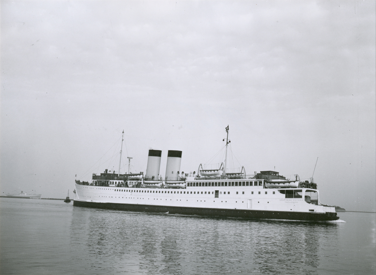 Foto i svartvitt visande tåg-ångfärjan DROTTNING VICTORIA taget i Köpenhamn under år 1955.