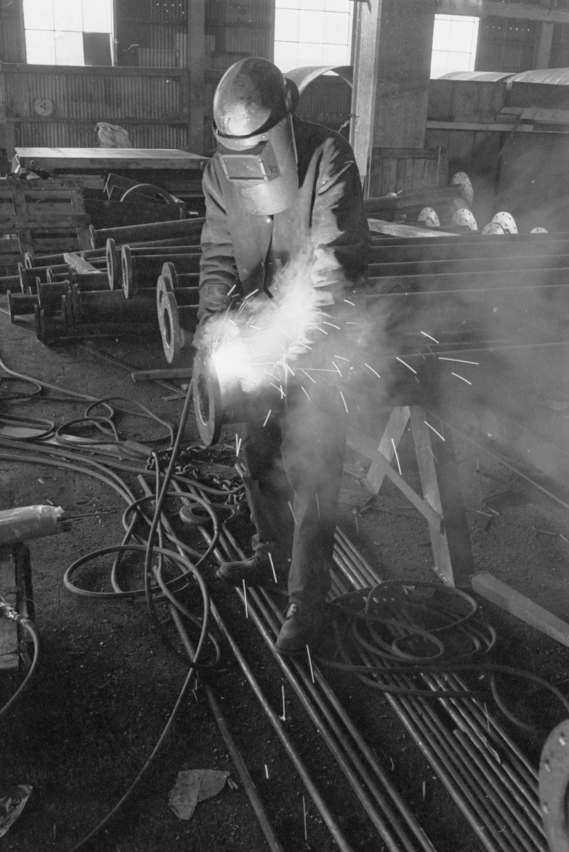 Ekensbergs varv. Verkstadsinteriör, svetsare i arbete.