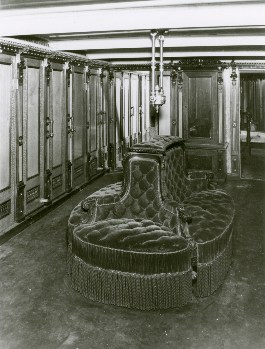 Titel: Interiörbilder från passagerarångfartyget S/S BIRGER JARL tagna i samband med skrotningen på Finnboda varv 1951. Fartyget gick på linjen Stockholm-Göteborg-Kristiania. Först för Ångfartygs AB Södra Sverige och efter 1909 för Rederi AB Svea.