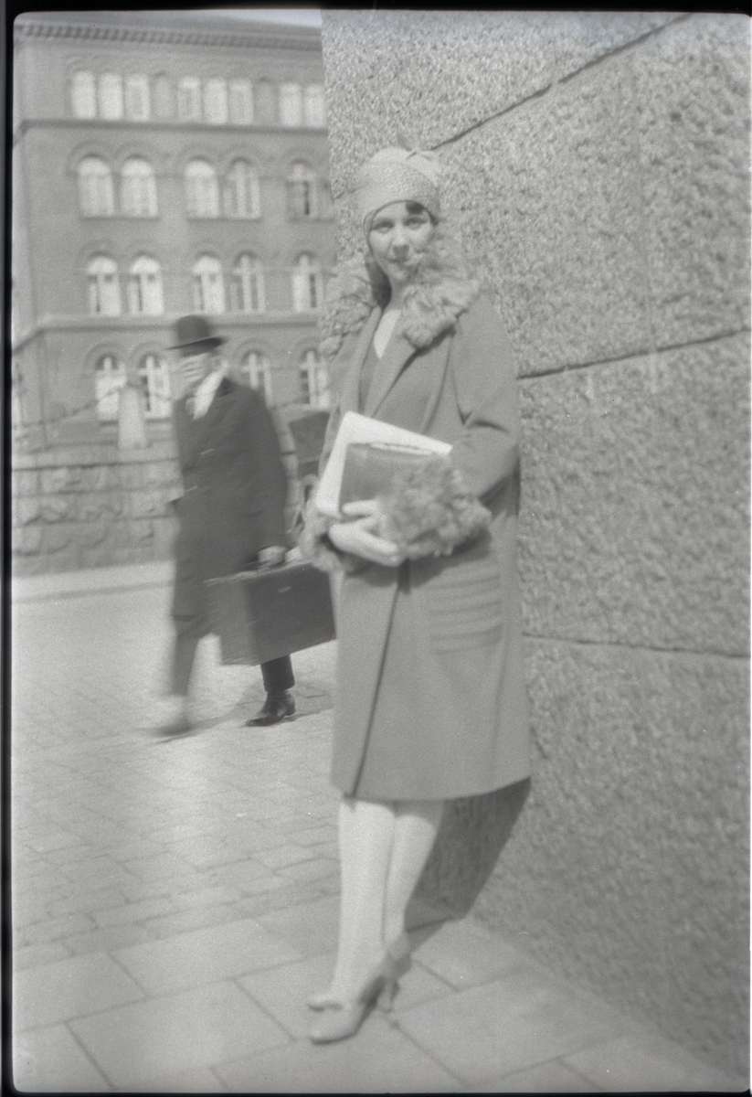 Kvinna, "E. E.", vid hörnet Linnégatan-Fredrikshovsgatan på Östermalm i Stockholm våren 1929. I bakgrunden skymtar det som tidigare var livgardesregementenas kasernbyggnader men som i dag (2017) är en del av kontorskomplexet Garnisonen.