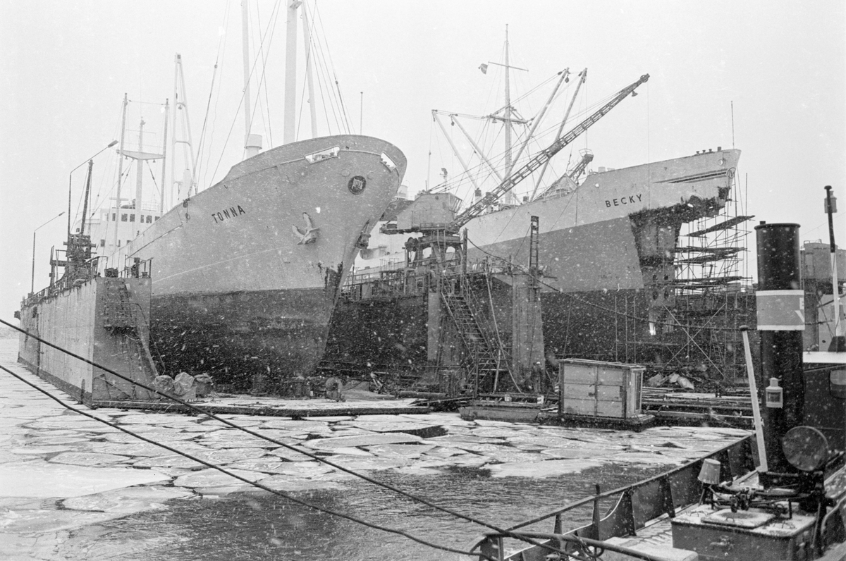 Ekensbergs varv 1970. I lilla respektive stora dockan lastmotorfartygen TONNA (till v.) och BECKY (till h.). I förgrunden skymtar bogserbåten EKENSBERG (urspr. WIDAR).