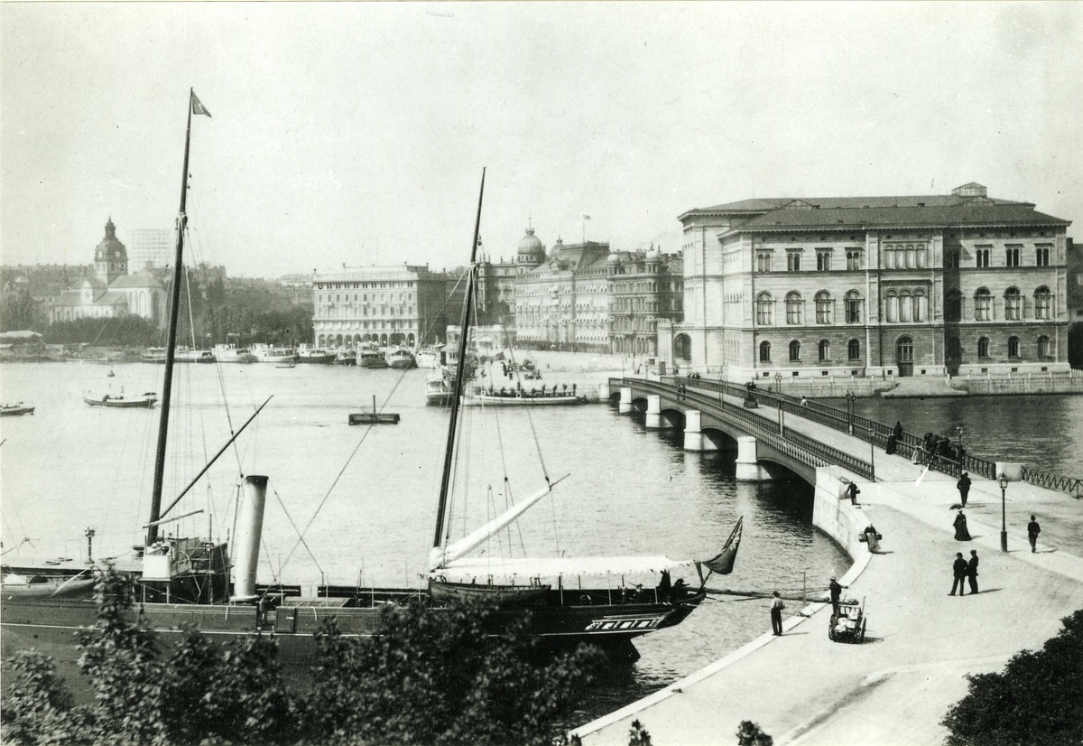 Utsikt över Skeppsholmsbron och södra Blasieholmskajen. Fotografiet taget av Lindahls Fotografiaffär omkring år 1890.