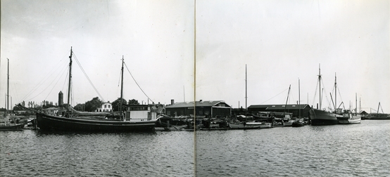 Hamnen sedd mot söder tv på bilden ovan. Tv motorgaleasen Vernadia. Skjulet i mitten är Råå Båtvarv, som bygger livbåtar och andra småbåtar. Skjulet th därom har varit ett annat nu nedlagt småbåtsvarv. Th en finsk fd 3-mast-skonare, utanför den en gammal skuta, som nu går med sportfijksare ut i sundet. Längst th skymtar Holms skeppsvarv. Skåne, Malmöhus län, Råå.