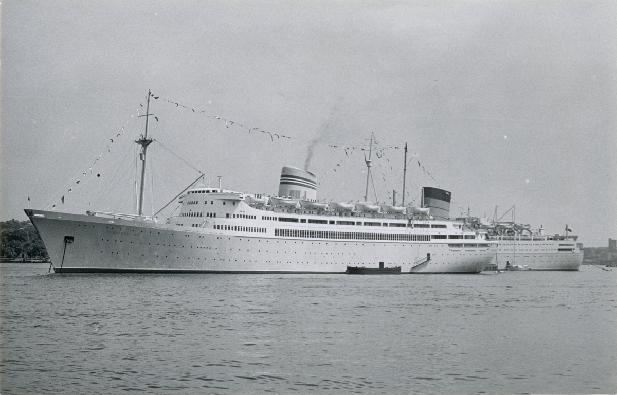 passagerarmotorfartyg BERGENSFORD av Bergen för ankar i Stockholms ström.