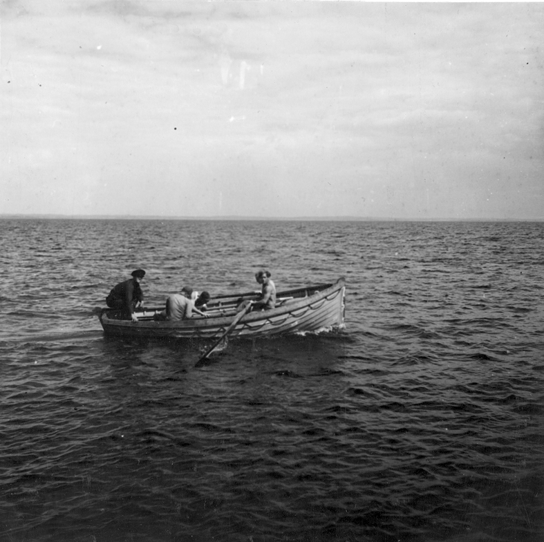 Den överbord hyvade (hivade) livbojen har bärgats och båten är på återväg till fartyget. Fil lic Gunnar Jonssons undersökningsresa till Västkusten juni 1940.