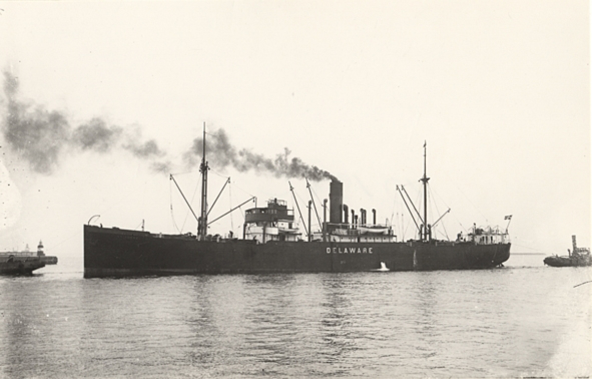 Foto i svartvitt visande lastturbinångfartyget "DELAWARE" av Köpenhamn under bogsering i Köpenhamn, troligen under 1930-talet.