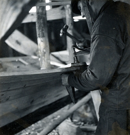 Fredrik Jonssons varv.En 30 fots klinkbåt under byggnad. Skarvlapp på ett bord fästes med skruvtving och klinkas.