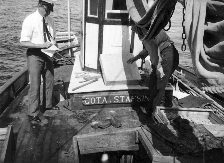 Göteborgs Örlogsdepå. Proviantupphandling till sjöss. Uppbördsstyrman har begivit sig över till fiskekuttern Göta av Stafsinge för upphandling av färsk fisk. Fil Gunnar Jonssons undersökningsresa till västkusten juni 1940. 116