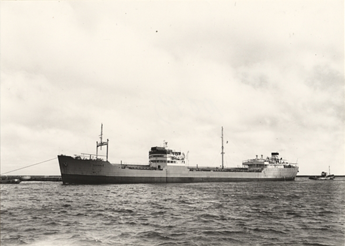 Foto i svartvitt visande malmtankmotorfartyget "HASSELÖ" i Köpenhamn i mars månad 1956.