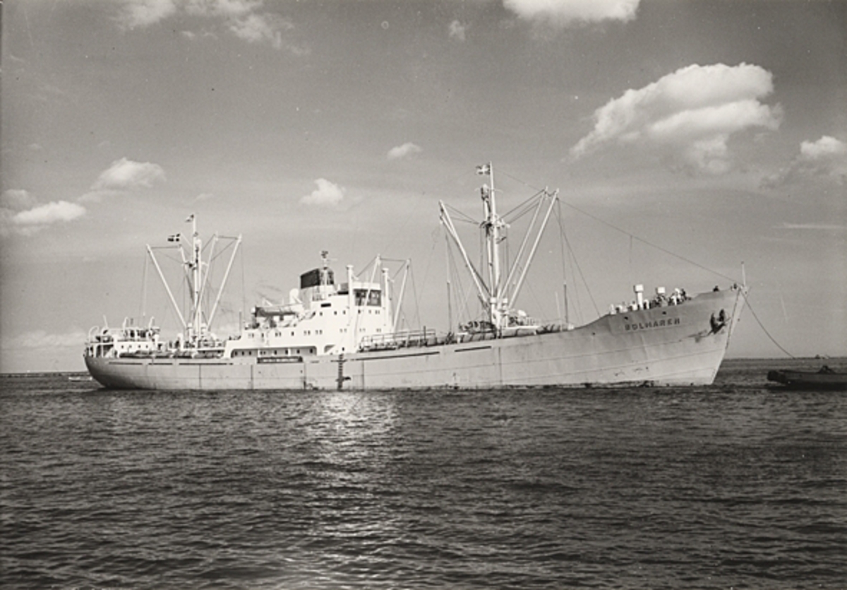 Titel: Foto i svartvitt visande lastmotorfartyget "BOLMAREN" i Köpenhamn under juni månad 1956.
