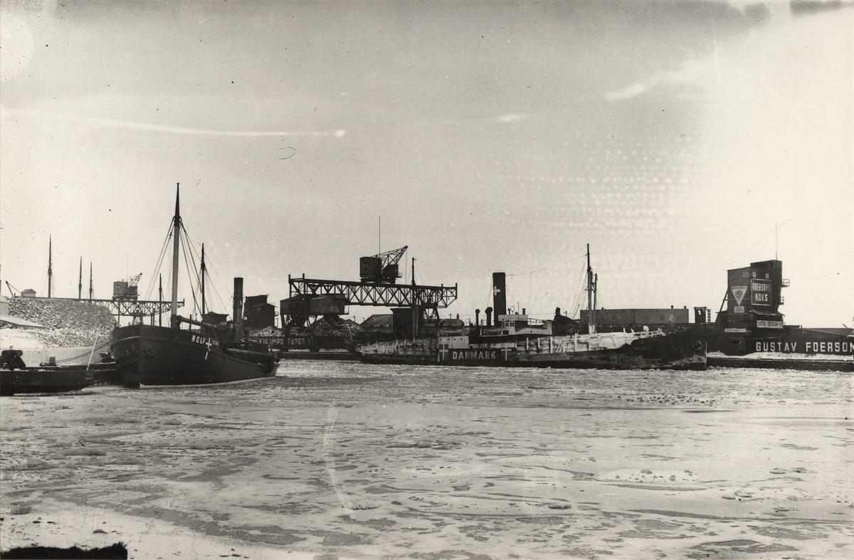 Foto i svartvitt visande lastångfartygen "OSLO" och "ROLF" vid kaj i Köpenhamn under andra världskriget.