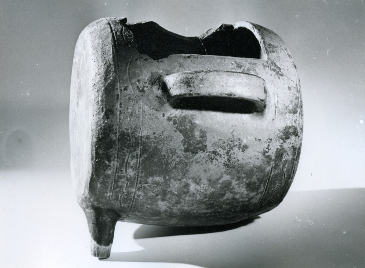 "Glaserat defekt lerkärl med större fyrkantig öppning och fyra ben, två skänklar. Högra sidan dekorerad med centrumknapp."