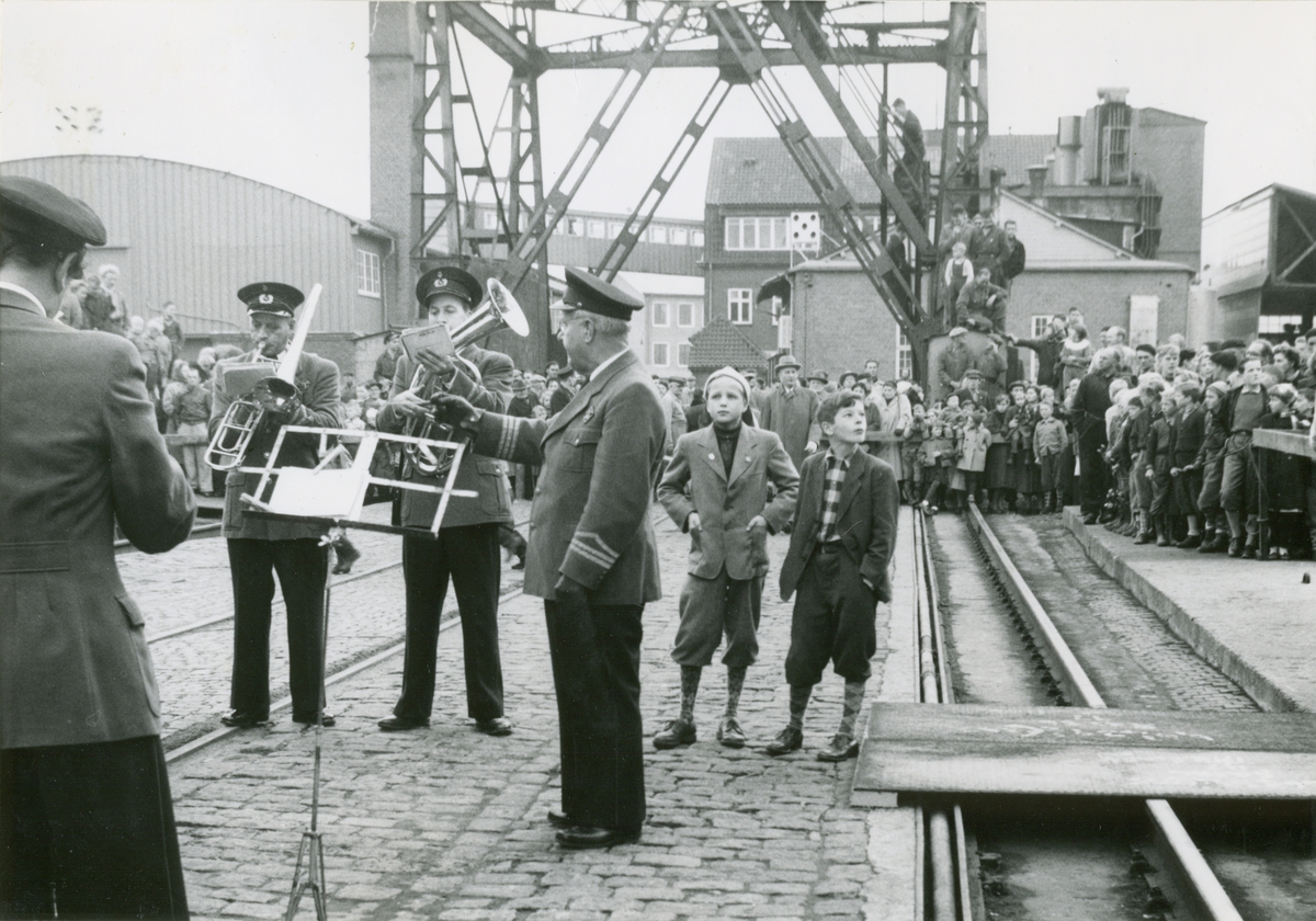 Ceremonier vid passagerarmotorfartyget GRIPEN av Malmö, sjösättning i Aahlborg, Danmark, 19/10 1955.