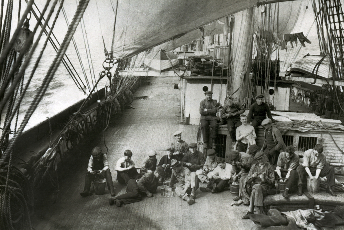 Ombord i 4-mastbarken Beatrice av Göteborg 1922/1923. frivakten ligger inne en söndag i passaden. Båtsman stter på svinburen, Vilhelm Carlander tvättar vita skjortan. Närmast focken, där bakom storen.