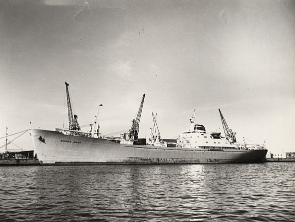 Foto i svartvitt visande lastmotorfartyget BUENOS AIRES. Fotot taget i Köpenhamn juni månad 1960.