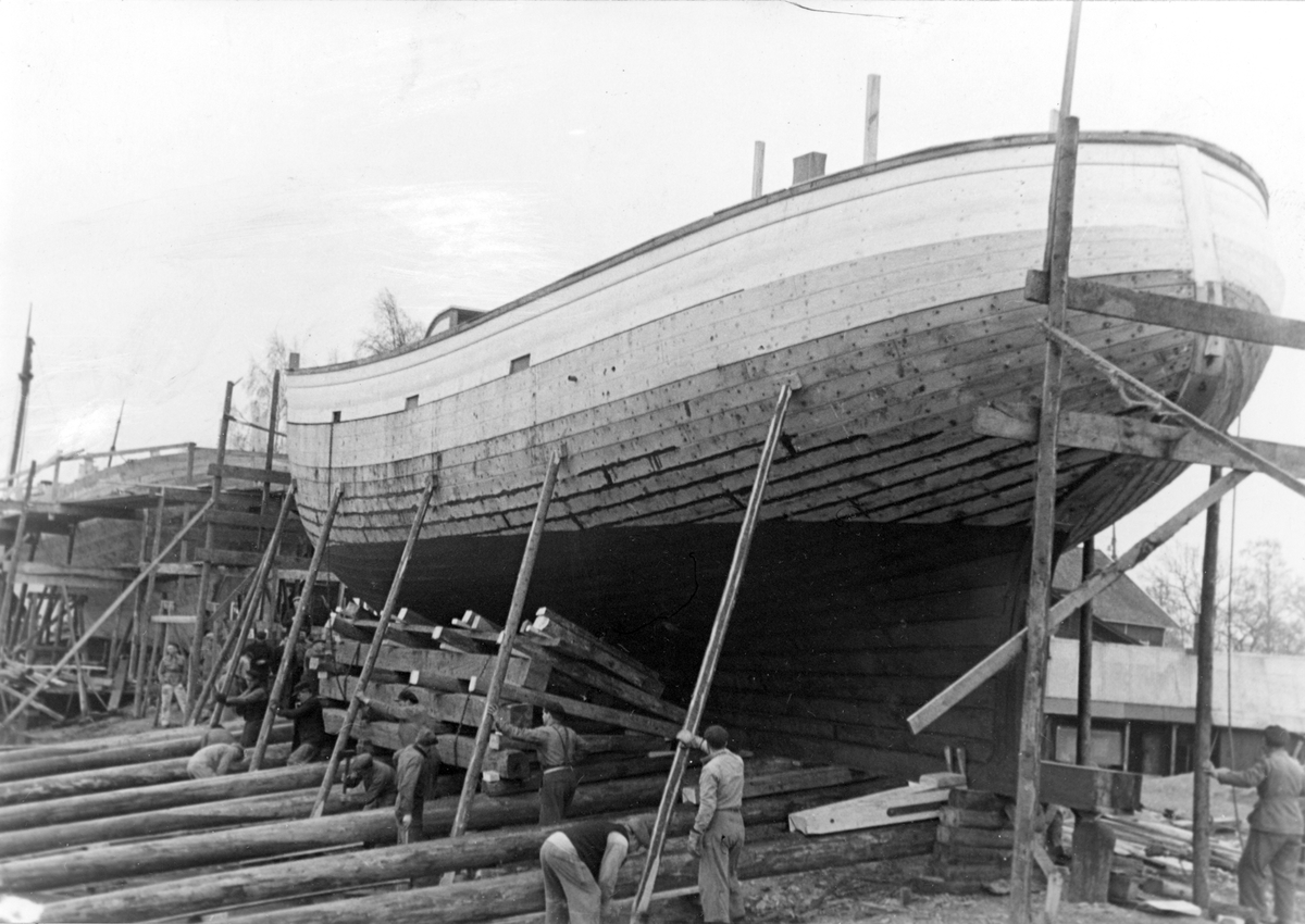 Fiskebåt för Ryssland under byggnad 1950. Bordläggningen klar. Babords sida och akterskeppet