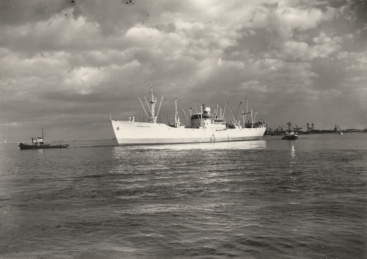 Titel: Foto i svartvitt visande lastmotorfartyget "SAMELAND" i Köpenhamn juli månad 1955.