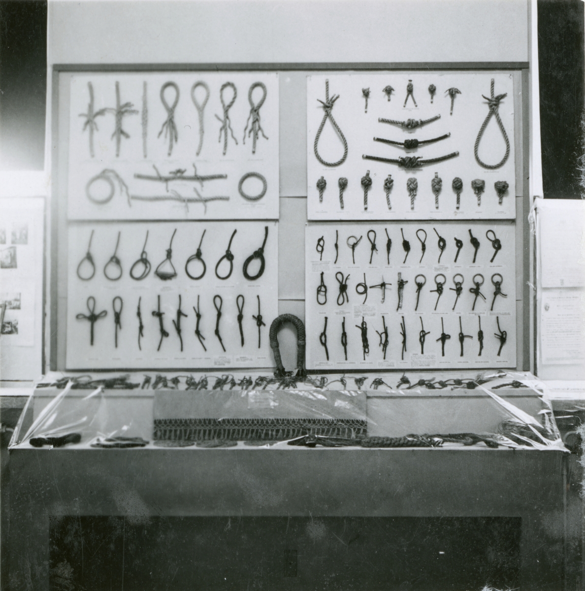 Utställning om knopar i avdelningen för sjömmannautbildning och sjömannaorganisation i Sjöfartsavdelningen. Bilden tagen under uppordnande av utställningen våren 1937.