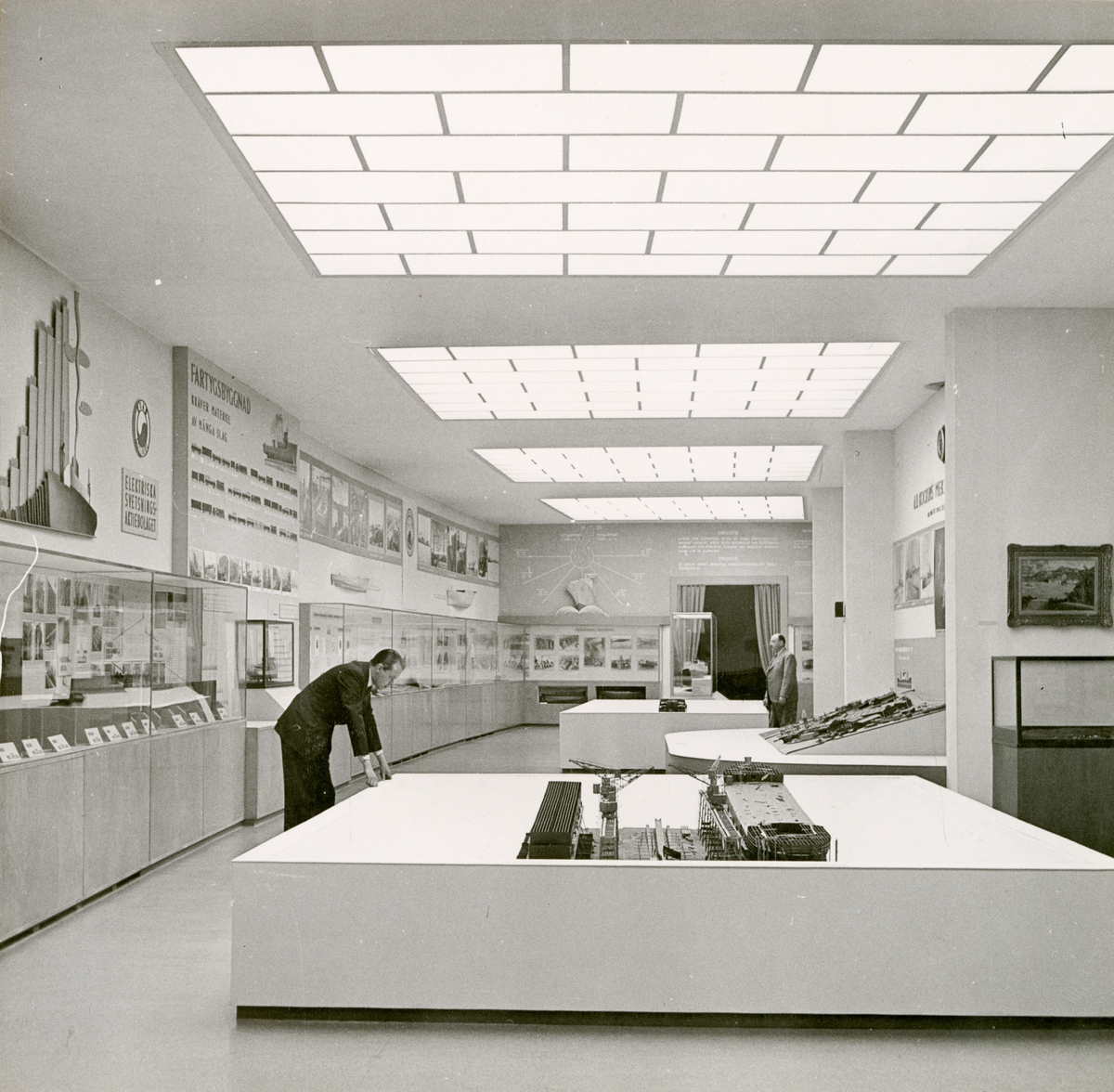 Tillfälliga utställningen, Varv och skeppsbyggeri. Sal 5. Miljöbild med två personer i utställningen