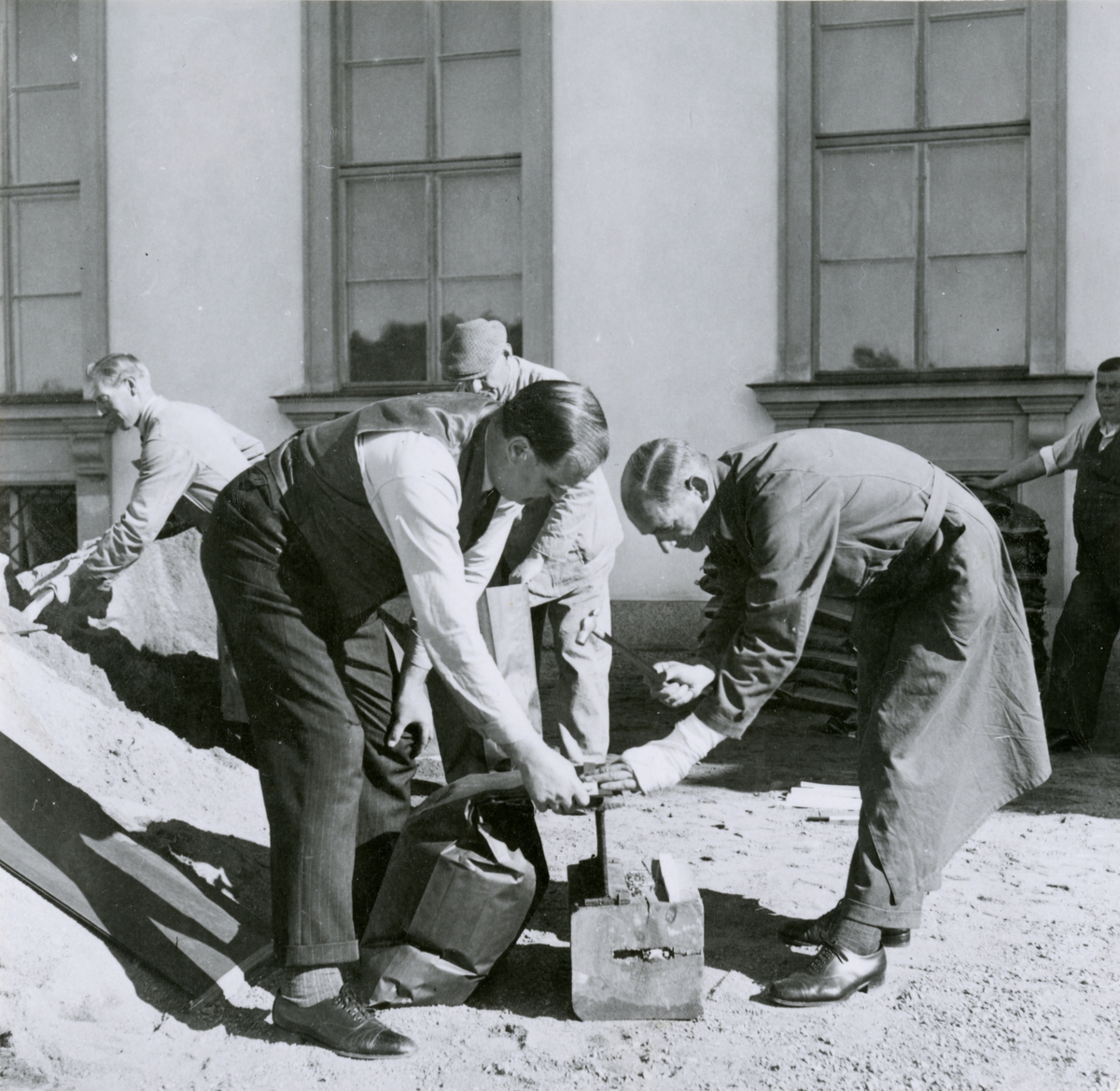Lufskyddsåtgärder utanför Sjöhistoriska museet. Sandsäcken spikas igen av modellbyggare Wahlström. Till vänster Herr Åberg.