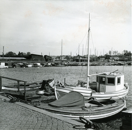 Inre delen av hamnen sedd från kajen i N mot SO. I förgrunden en gammal, nu ombyggd däcksbåt. Skåne, Malmöhus län, Råå.